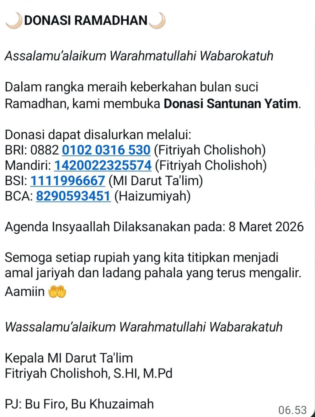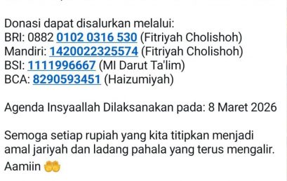 Menebar Kasih dalam Kegiatan Santunan Anak Yatim Alhamdulillah, sebagai bentuk kepedulian sosial dan implementasi nilai-nilai keislaman, MI dan Pondok Pesantren Darut Ta’lim Surabaya kembali menggelar kegiatan Santunan Anak Yatim yang berlangsung penuh khidmat dan kebersamaan. Kegiatan ini menjadi momentum penting untuk menanamkan nilai empati, kasih sayang, dan semangat berbagi kepada seluruh warga madrasah. Santunan bukan sekedar memberikan materi, melainkan wujud perhatian dan cinta kepada anak-anak yatim agar mereka merasa dihargai, diperhatikan, dan dikuatkan. Acara diawali dengan pembacaan ayat suci Al-Qur’an, dilanjutkan Berbagai Kepala Madrasah yang mengingatkan pentingnya memuliakan anak yatim sebagaimana yang diajarkan dalam Al-Qur’an dan hadits. Suasana haru dan bahagia menggagalkan ruangan saat santunan diberikan secara simbolis kepada anak-anak yang hadir. Selain pemberian bantuan berupa uang tunai, paket sembako, dan perlengkapan sekolah, kegiatan ini juga diisi dengan doa bersama agar seluruh donatur, guru, dan keluarga besar madrasah selalu diberikan keberkahan serta kemudahan dalam setiap urusan. Melalui kegiatan ini, madrasah berharap dapat terus menjadi lembaga pendidikan yang tidak hanya unggul dalam bidang akademik, tetapi juga kuat dalam pelatihan karakter dan kepedulian sosial. Semoga setiap kebaikan yang diberikan menjadi amal jariyah yang terus mengalir pahalanya. Mari terus menebar kebaikan dan memperkuat ukhuwah demi masa depan generasi yang lebih baik. 🤲 Semoga Allah SWT membalas setiap kebaikan dengan keberkahan yang berlipat ganda. Aamii…