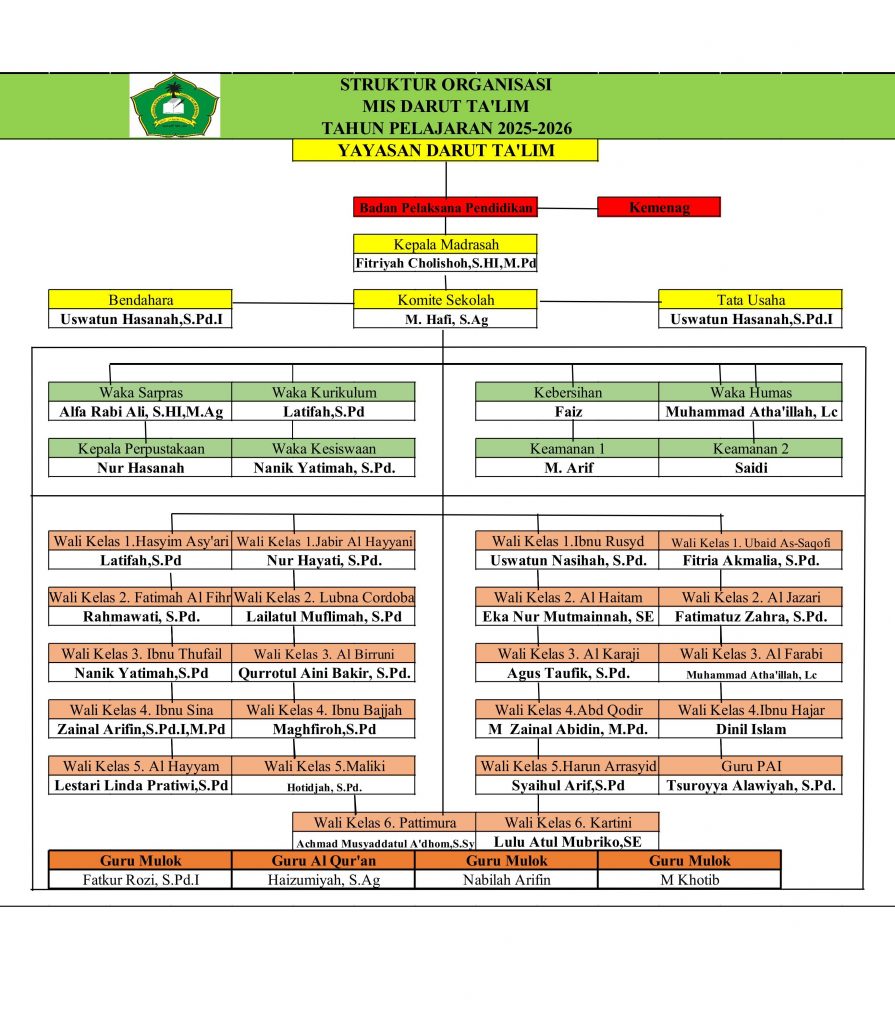 MI. Darut Ta’lim adalah lembaga pendidikan dasar formal yang mengintegrasikan kurikulum nasional dengan kurikulum pesantren. Melalui pendekatan holistik, MI Darut Ta’lim tidak hanya mengembangkan aspek akademik siswa, tetapi juga menanamkan nilai-nilai keislaman yang kuat. Salah satu program unggulannya adalah pembinaan cinta Al-Qur’an melalui kegiatan tahfidz Juz ‘Amma, sebagai fondasi akhlak dan spiritualitas sejak dini. MI Darut Ta’lim berkomitmen mencetak generasi Qur’ani yang cerdas, berakhlak, dan berdaya saing tinggi di era modern.