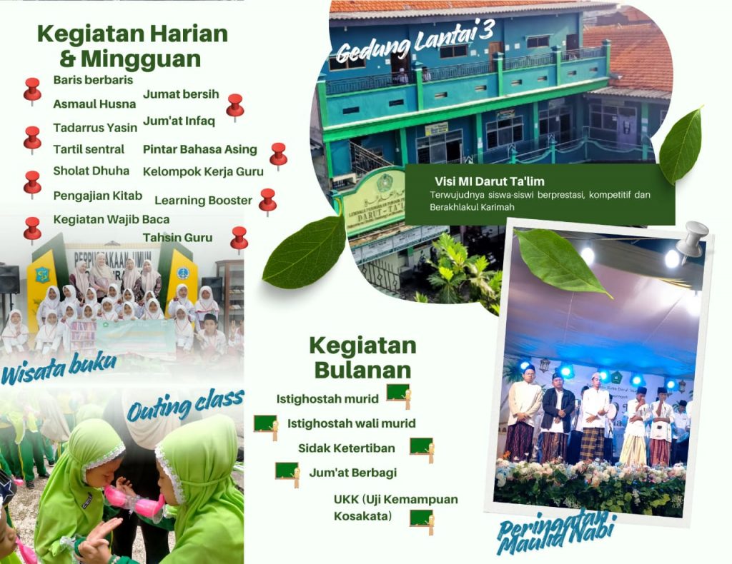 MI Darut Ta’lim berkomitmen untuk memberikan pendidikan yang seimbang antara ilmu pengetahuan umum dan pendidikan keagamaan , dengan menanamkan nilai-nilai akhlakul karimah, kedisiplinan, kemandirian, serta cinta Al-Qur’an sejak dini. Kami meyakini bahwa pendidikan dasar merupakan landasan penting dalam membentuk karakter dan masa depan anak-anak kita.